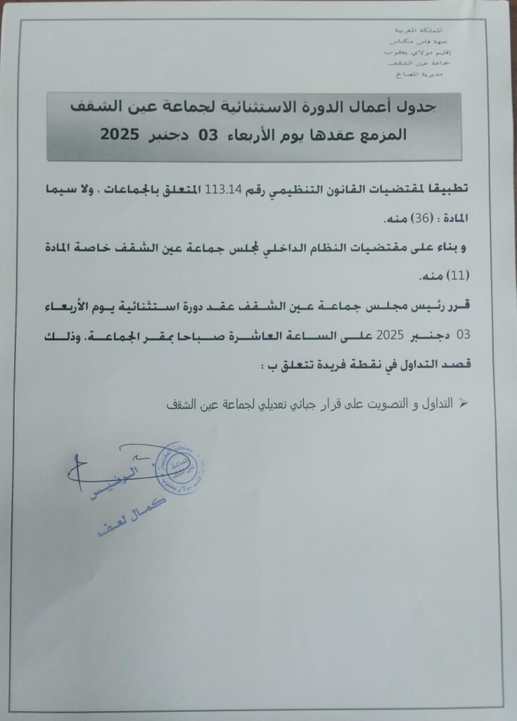 مكتب التواصل والعلاقات: جدول أعمال الدورة الاستثنائية لجماعة عين الشقف المزمع عقدها يوم الأربعاء 03 دجنبر 2025.