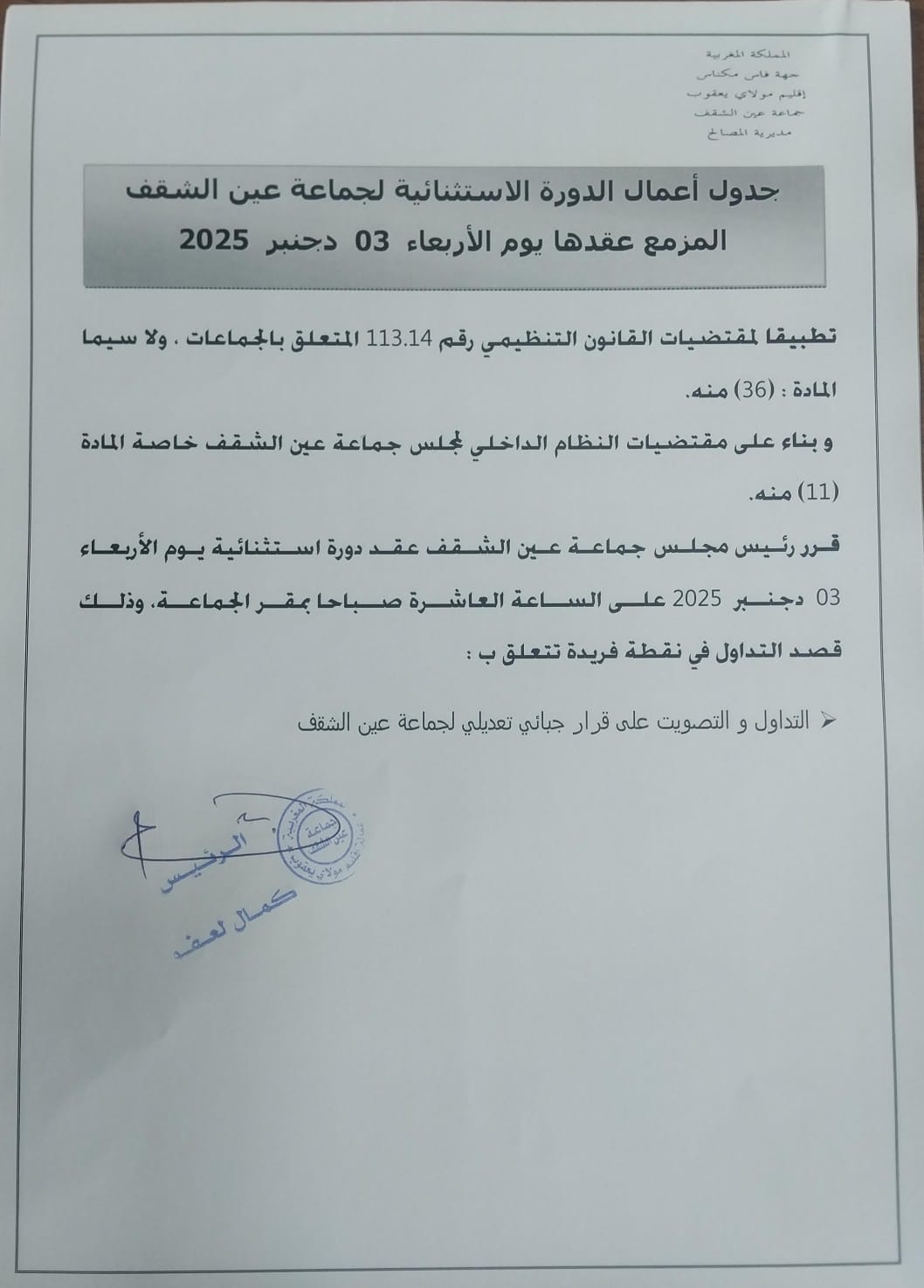 جدول أعمال الدورة الاستثنائية لجماعة عين الشقف المزمع عقدها يوم الأربعاء 03 دجنبر 2025.