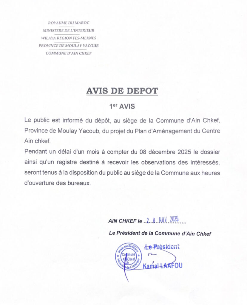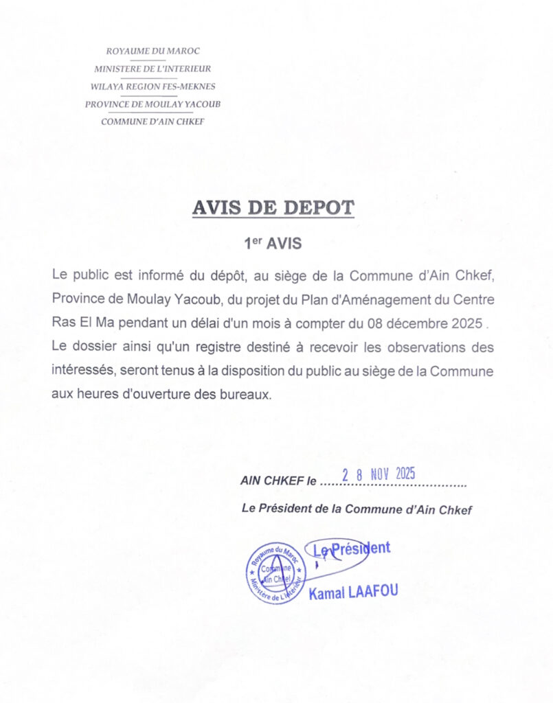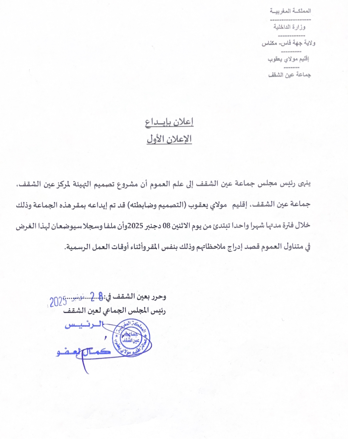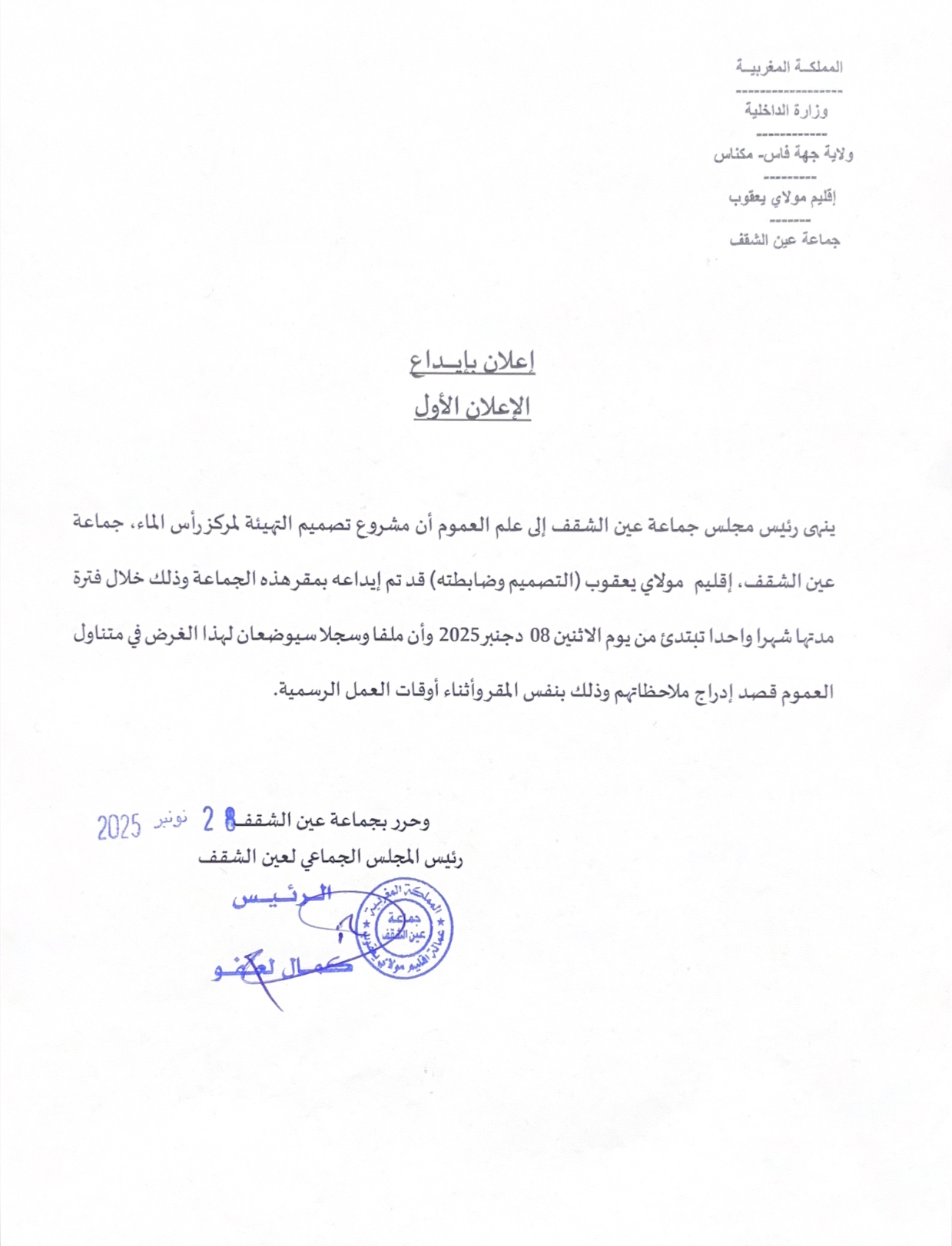 إعلانات متعلقة بالبحث العمومي لتصميمي التهيئة لمركزي عين الشقف وراس الماء جماعة عين الشقف إقليم مولاي يعقوب