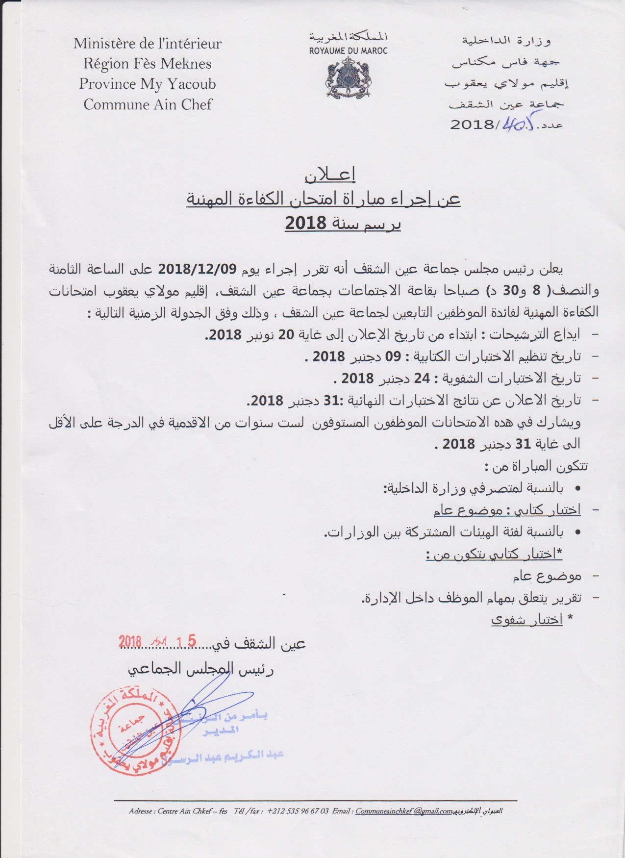 اعلان عن امتحانات الكفاءة المهنية بجماعة عين الشقف